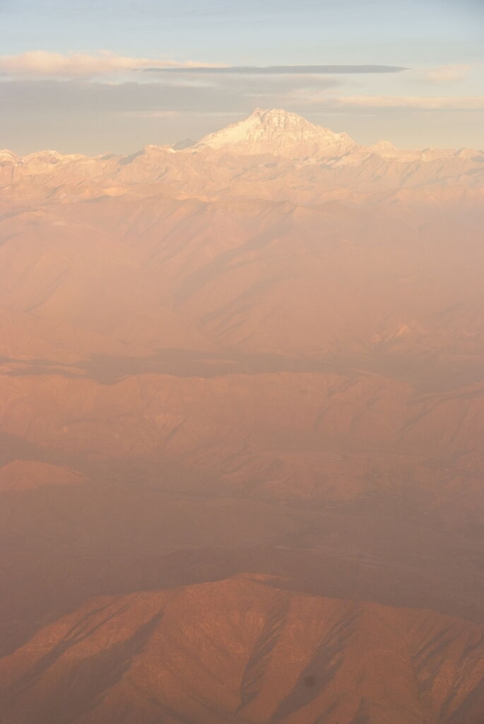 飛行機から眺めるアンデスの山々も「すごい!」の一言です。サンティアゴ空港を飛び立つとアメリカ大陸一であり、南半球一でもある標高6,962mの雪を頂いたアコンカグアが見え、それから4千~6千m級の山々が南北に連なっています。