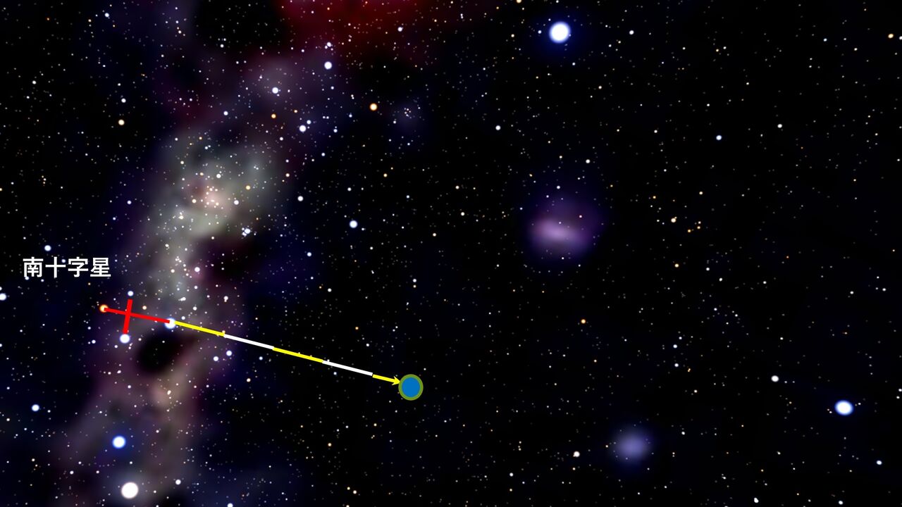 それからケンタウルス座のα星とβ星間の中心から垂線を伸ばしていき南十字星からきた線と交わる点である交点が天の南極。